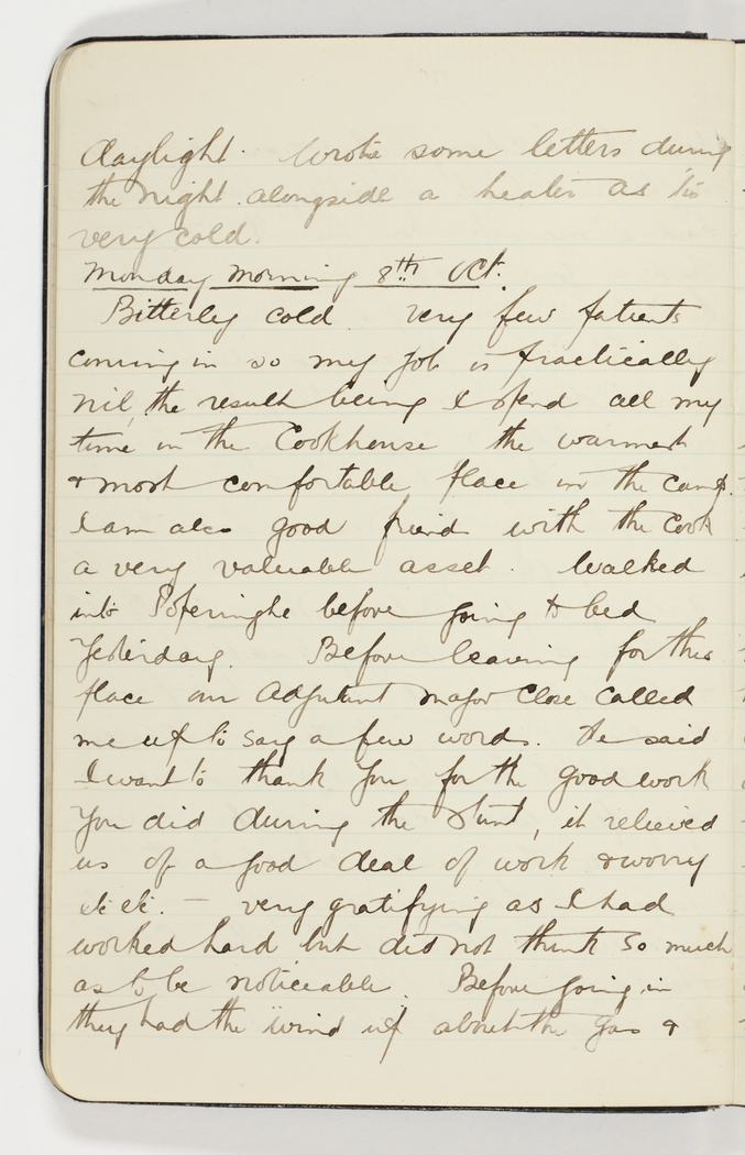 Monday morning 8th Oct. Bitterly cold. Very few patients coming in so my job is practically nil, the result being I spend all my time in the Cookhouse the warmest & most comfortable place in the camp. I am also good friends with the Cook a very valuable asset. Walked into Poperinghe before going to bed yesterday. Before leaving for this place our Adjutant Major Close called me up to say a few words. He said I want to thank you for the good work you did during the stunt, it relieved us of a good deal of work & worry etc. etc. – very gratifying as I had worked hard but did not think so much as to be noticeable. Before going in they had the wind up about the gas &