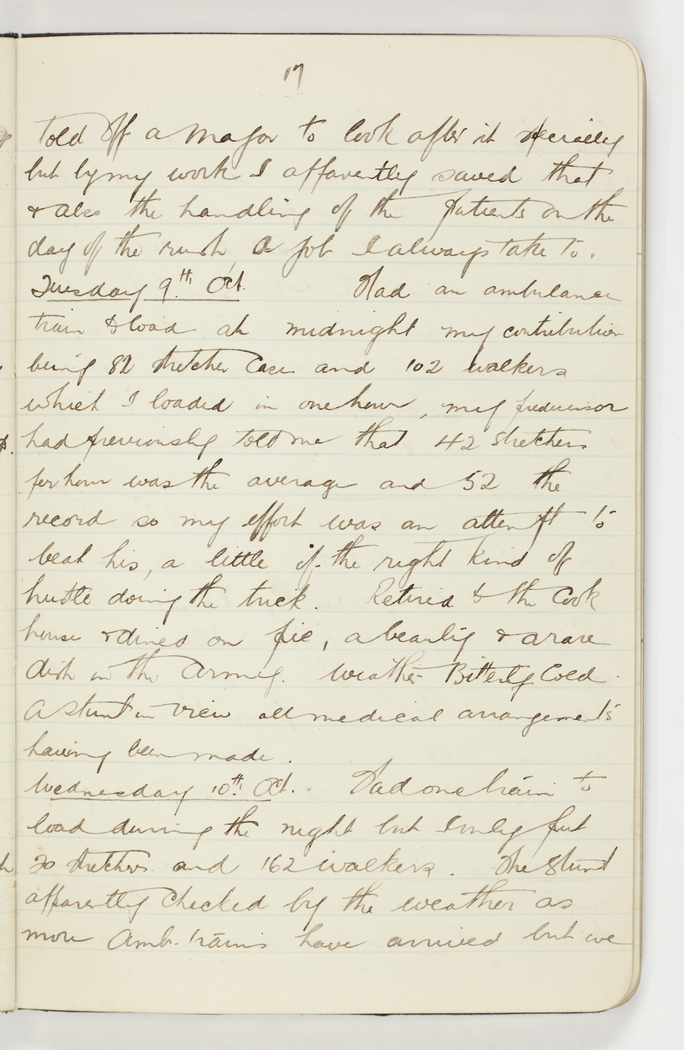 Tuesday 9th Oct Had an ambulance train to load at midnight my contribution being 82 stretcher cases and 102 walkers which I loaded in one hour, my predecessor had previously told me that 42 stretchers for him was the average and 52 the record so my effort was an attempt to beat his, a little of the right kind of hustle doing the trick. Retired to the Cookhouse & dined on pie, a beauty & a rare dish in the army. Weather bitterly cold. A stunt in view all medical arrangements having been made.