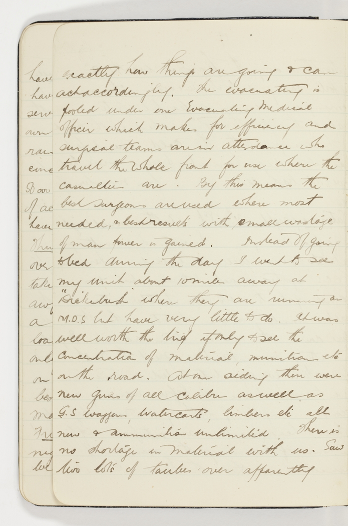 exactly how things are going & can act accordingly. The evacuating is pooled under one Evacuating Medical Officer which makes for efficiency and surgical teams are in attendance who travel the whole front for use where the casualties are. By this means the best surgeons are used where most needed, & best results with small wastage of man power is gained. Instead of going to bed during the day I went to see my unit about 10 miles away at Dickebush where they are running an M.D.S. but have very little to do. It was well worth the trip if only to see the concentration of material, munitions etc. on the road. At one siding there were new guns of all calibre as well as G.S. waggons, watercarts, limbers etc. all new & ammunition unlimited. There is no shortage in Material with us. Saw two lots of taubes over apparently