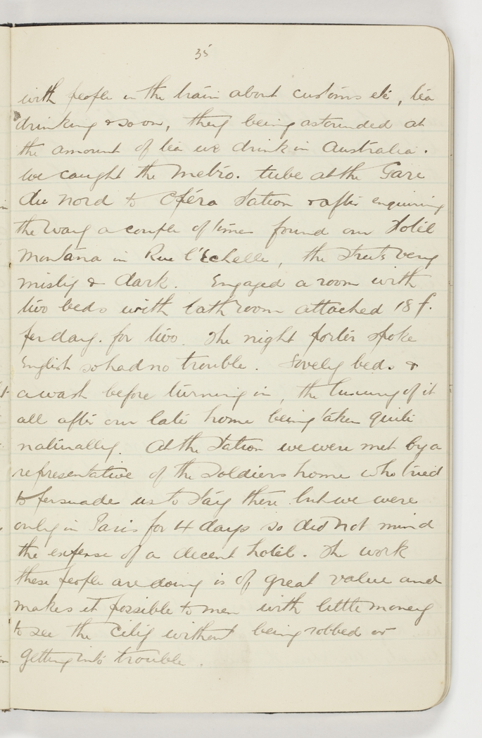 with people in the train about customs etc. tea drinking & so on, they being astounded at the amount of tea we drink in Australia. We caught the Metro tube at the Gare du Nord to Opera station & after enquiring the way a couple of times found our Hotel Montana in Rue l'Echelles, the streets very misty & dark. Engaged a room with two beds with bathroom attached 18f per day for two. The night porter spoke English so had no trouble. Lovely beds & a wash before turning in, the luxury of it all after our late home being taken quite naturally. At the station we were met by a representative of the Soldiers home who tried to persuade us to stay there but we were only in Paris for 4 days so did not mind the expense of a decent hotel. The work these people are doing is of great value and makes it possible to men with little money to see the city without being robbed or getting into trouble.