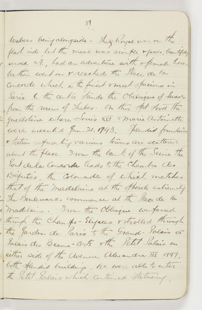 Webers being alongside. The Royal was on the flash side, but the meal was simple & good, beautifully served 10F, had an adventure with a female here. We then went on & reached the Place de la Concorde which is the finest & most spacious in Paris. In the centre stands the Obelisque of Luxor from the ruins of Thebes. On this spot stood the guillotine where Louis XVI & Marie Antoinette were executed Jan. 21. 1793. Splendid fountains & statues representing various towns are scattered about the place. From the bank of the Seine the Pont de la Concorde leads to the Chambre des Deputes, the colonnade of which matches that of the Madelaine at the opposite extremity. The Boulevard commences at the Place de la Madelaine. From the Obilesque we passed through the Champs Elysees & strolled through the Jardin de Paris to the Grand-Palais on either side of the Avenue Alexandra III 1897, both splendid buildings. We were able to enter the Petit Palais which contained statuary,