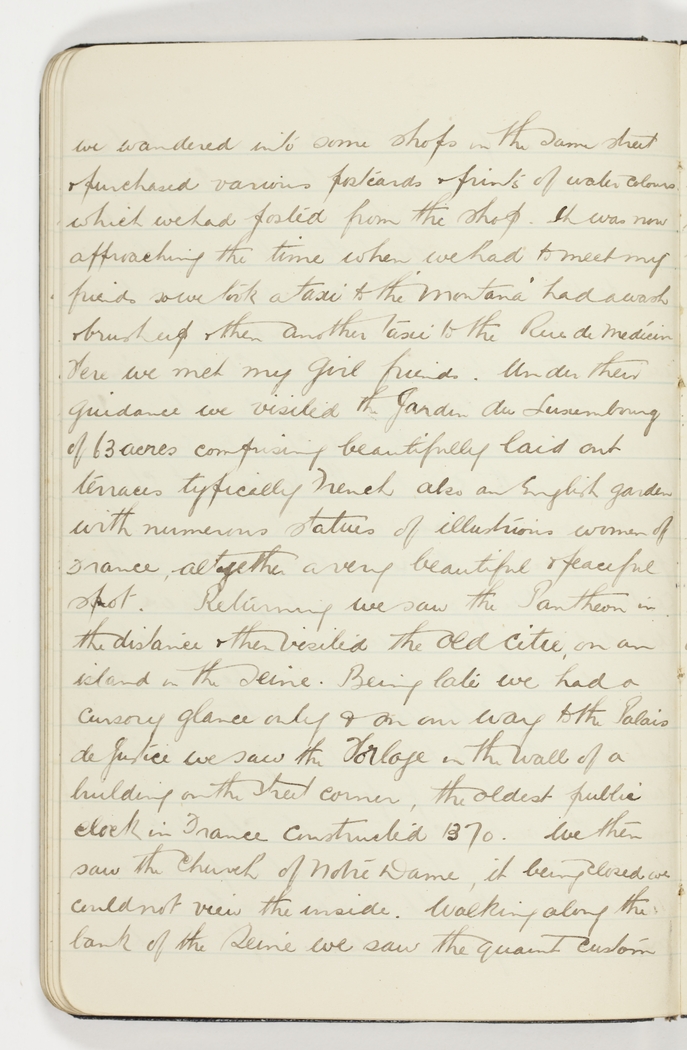we wandered into some shops in the same street & purchased various postcards & prints of watercolours which we had posted from the shop. It was now approaching the time when we had to meet my friends so we took a taxi to the "Montana" had a wash & brush up & then another taxi to the Rue de Medicin. Here we met my girl friends. Under their guidance we visited the Jardin du Luxembourg of 63 acres comprising beautifully laid out terraces typically French also an English garden with numerous statues of illustrious women of France, altogether a very beautiful & peaceful spot. Returning we saw the Pantheon in the distance & then visited the old citie, on an island in the Seine. Being late we had a cursory glance only & on our way to the Palais de Justice we saw the Horlage in the wall of a building on the street corner, the oldest public clock in France constructed 1370. We then saw the Church of Notre Dame, it being closed we could not view the inside. Walking along the bank of the Seine we saw the quaint custom