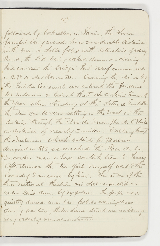followed by booksellers in Paris, the stone parapet being covered for a considerable distance with boxes or stalls filled with literature of every kind, the lid being locked down on closing. Here we saw the bridge Pont-Neuf commenced in 1578 under Henri III. Crossing the Seine by the Pont du Carrousel we entered the Jardin des Tuileries & learnt that at certain times of the year when standing at the statue de Gambetta the sun can be seen setting in the west in the distance through the Arc de Triomphe de l'Etoile a distance of nearly 2 miles. Walking through the Tuileries which extend for 72 acres designed in 1665, we reached the Place de la Concorde near where we took tram to Passy. After dinner the two girls & myself went to the Comedy Francaise by taxi. This is one of the three national theatres & is still conducted on rules laid down by Napoleon. The people were quietly dressed as a law forbids evening dress during wartime, the audience struck me as being very orderly & undemonstrative.