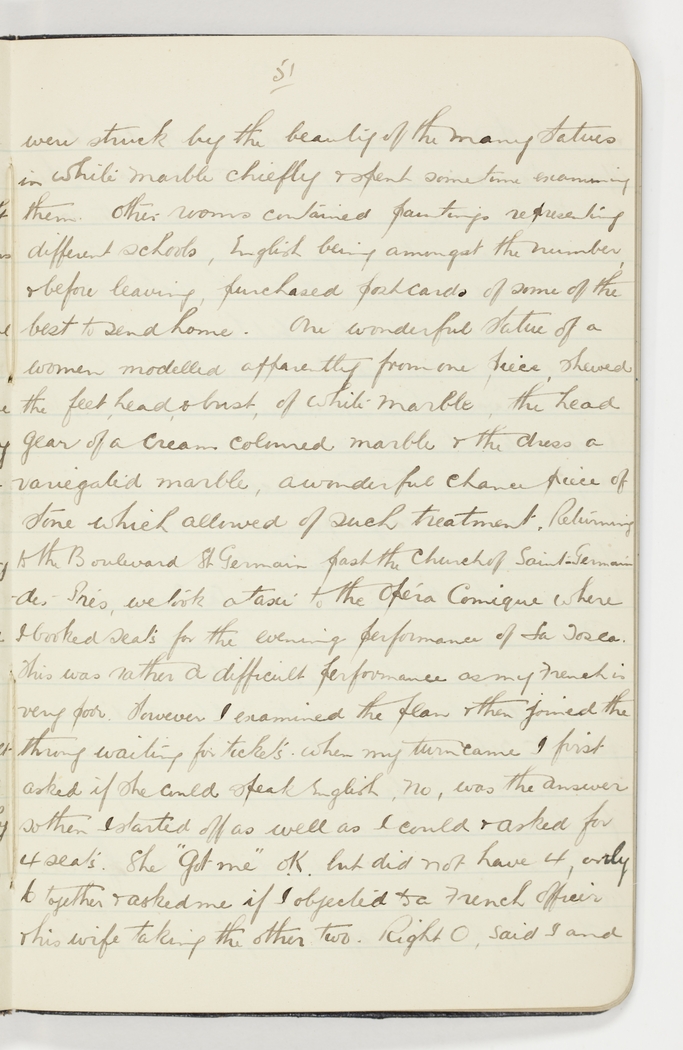 were struck by the beauty of the many statues in white marble chiefly & spent some time examining them. Other rooms contained paintings representing different schools, English being amongst the number & before leaving, purchased postcards of some of the best to send home. One wonderful statue of a woman modelled apparently from one piece, shewed the feet head & bust of white marble, the head gear of a cream coloured marble & the dress a variegated marble, a wonderful chance piece of stone which allowed of such treatment. Returning to the Boulevard St Germain past the Church of Saint Germain des Pres, we took a taxi to the Opera Comique where I booked seats for the evening performance of La Tosca. This was rather a difficult performance as my French is very poor. However, I examined the plan & then joined the throng waiting for tickets when my turn came I first asked if she could speak English, no, was the answer so then I started off as well as I could & asked for 4 seats. She "got me" OK but did not have 4, only 6 together & asked me if I objected to a French Officer & his wife taking the other two. Right O, said I and