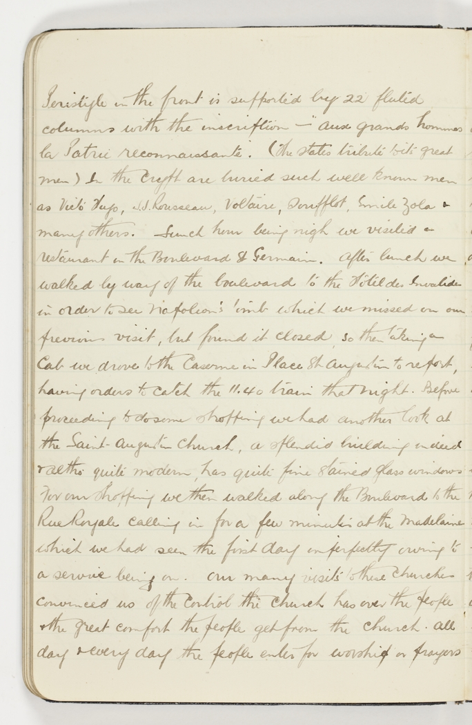 Peristyle in the front is supported by 22 fluted columns with the inscription – 'aux grands hommes la Patrie reconnaissante.' (The states tribute to its great men) In the crypt are buried such well known men as Victo Hugo, J.J.Rousseau, Voltaire, Soufflot, Emile Zola & many others. Lunch time being nigh we visited a restaurant in the Boulevard St Germain. After lunch we walked by way of the boulevard to the Hotel des Invalides in order to see Napoleon's tomb which we missed on our previous visit, but found it closed, so then taking a cab we drove to the Caserne in Place St Augustin to report, having orders to catch the 11.40 train that night. Before proceeding to do some shopping we had another look at the Saint-Augustin Church, a splendid building indeed & altho' quite modern, has quite fine stained glass windows. For our shopping we then walked along the Boulevarde to the Rue Royale calling in for a few minutes at the Madelaine which we had seen the first day imperfectly owing to a service being on. Our many visits to these churches convinced us of the control the church has over the people & the great comfort the people get from the church all day & every day the people enter for worship or prayers