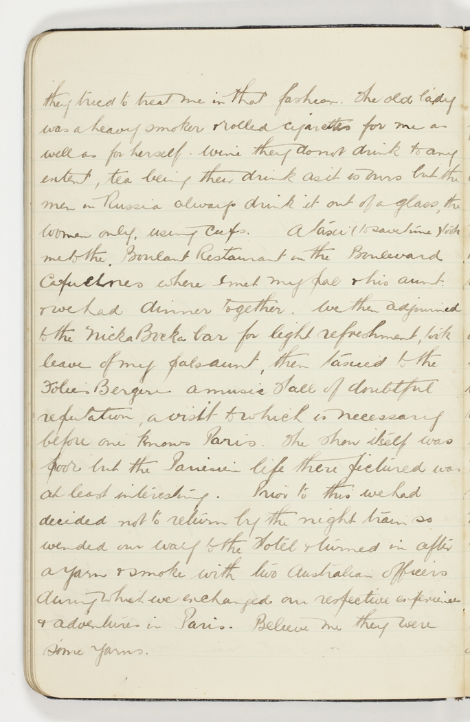 they tried to treat me in that fashion. The old lady was a heavy smoker & rolled cigarettes for me as well as for herself. Wine they do not drink to any extent, tea being their drink as it is ours but the men in Russia always drink it out of a glass, the women only, using cups. A taxi (to save time) took me to the Boulant Restaurant in the Boulevard Capuchines where I met my pal & his aunt & we had dinner together. We then adjourned to the Nicka Bocka bar for light refreshment, took leave of my pals aunt, then taxied to the Folies Bergere a music Hall of doubtful reputation, a visit to which is necessary before one knows Paris. The show itself was poor but the Parienne life there pictured was at least interesting. Prior to this we had decided not to return by the night train so wended our way to the Hotel & turned in after a yarn & smoke with two Australian officers during which we exchanged our respective experiences & adventures in Paris. Believe me they were some yarns.