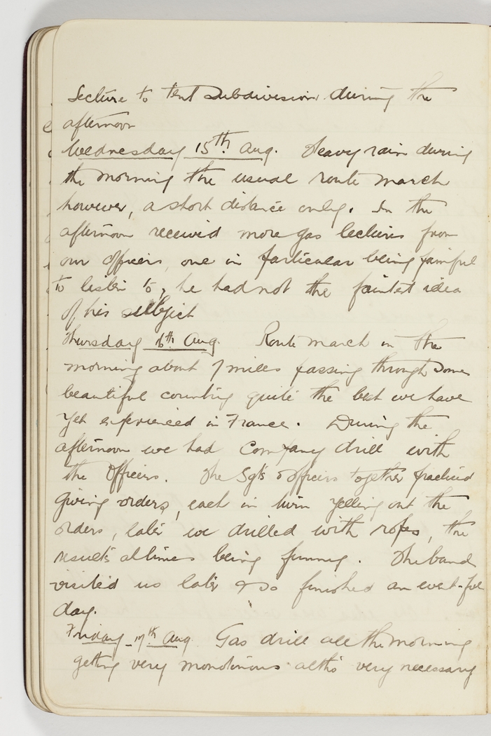Route march in the morning about 7 miles passing through some beautiful country quite the best we have yet experienced in France. During the afternoon we had the Company drill with the Officers. The Sgts & officers together practised giving orders, each in turn yelling out the orders, later we drilled with ropes, the results at times being funny. The band visited us later & so finished an event-ful day.