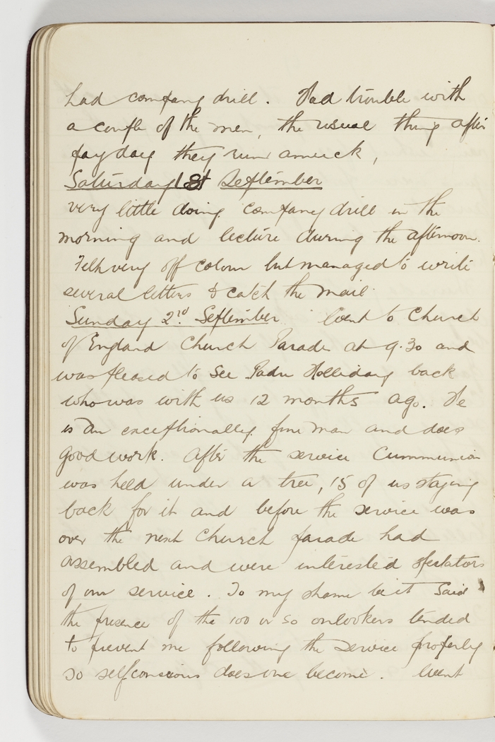 Went to Church of England Church Parade at 9.30 and was pleased to see Padre Holliday back who was with us 12 months ago. He is an exceptionally fine man and does good work. After the service Cummunion was held under a tree, 15 of us staying back for it and before the service was over the next Church parade had assembled and were interested spectators of our service. To my shame be it said the presence of the 100 or so onlookers tended to prevent me following the service properly so selfconscious does one become. Went