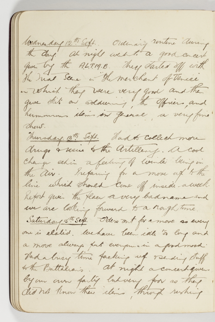 ordinary routine during the day. At night went to a good concert given by the A.L.T.M.B. They started off with the Trial Scene in "The Merchant of Venice" in which they were very good and then gave skits on soldiering, the officers, and humorous items in general, a very fine show.