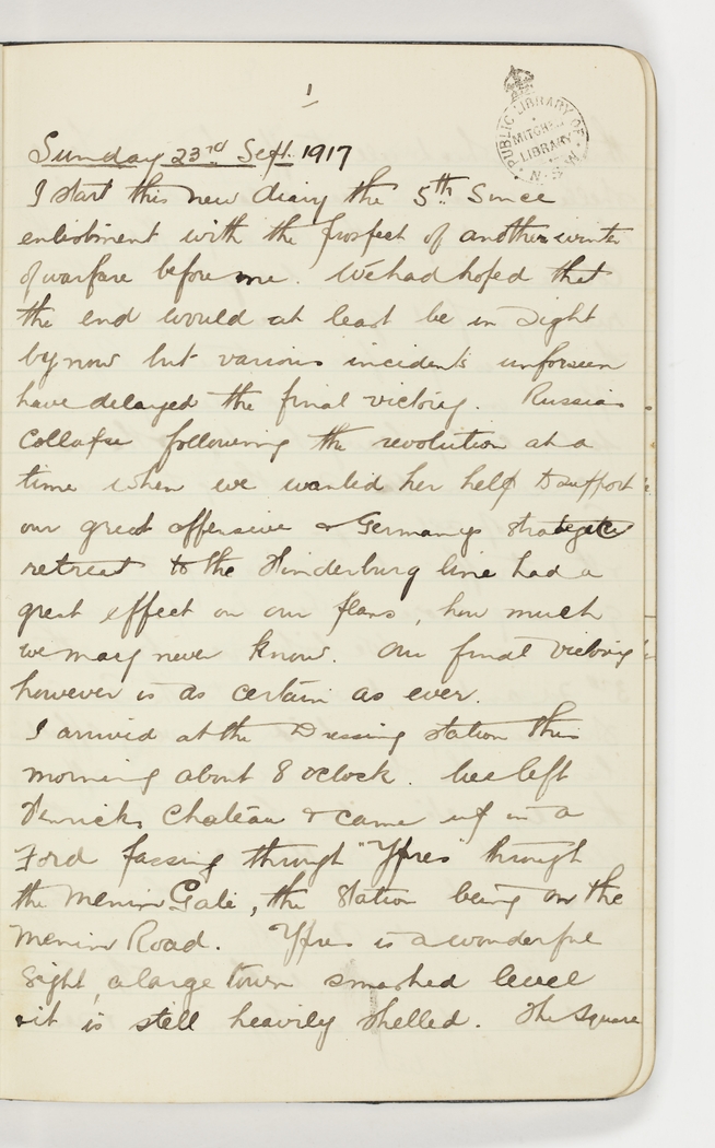I start this new diary the 5th since enlistment with the prospect of another winter of warfare before me. We had hoped that the end would at least be in sight by now but various incidents unforseen have delayed the final victory. Russia's collapse following the revolution at a time when we wanted her help to support our great offensive & Germany's strategic retreat to the Hindenburg line had a great effect on our plans, how much we may never know. Our final victory however is as certain as ever.