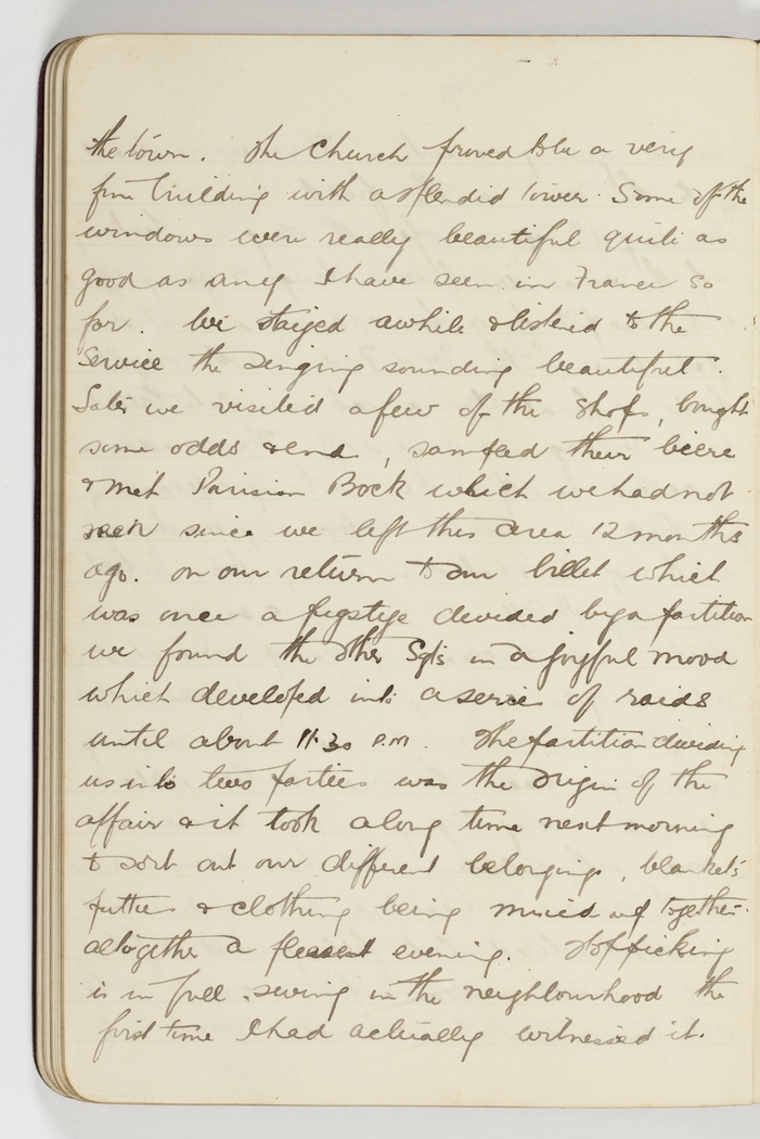 the town. The church proved to be a very fine building with a splendid tower. Some of the windows were really beautiful quite as good as any I have seen in France so far. We stayed awhile & listened to the service the singing sounded beautiful. Later we visited a few of the shops, bought some odds & ends, sampled their beere & met Parisian Bock which we had not seen since we left this area 12 months ago. On our return to our billet which was once a pigstye divided by a partition we found the other Sgts in a joyful mood which developed into a series of raids until about 11.30 P.M. The partition dividing us into two parties was the origin of the affair & it took a long time next morning to sort out our different belongings, blankets puttees & clothing being mixed up together, altogether a pleasant evening. Hop picking is in full swing in the neighbourhood the first time I had actually witnessed it.