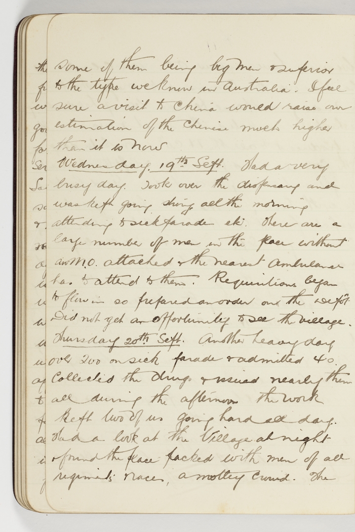 Another heavy day over 200 on sick parade & admitted 40. Collected the drugs & issued nearly them all during the afternoon the work kept two of us going hard all day. Had a look at the village at night & found the place packed with men of all regiments & races, a motley crowd. The