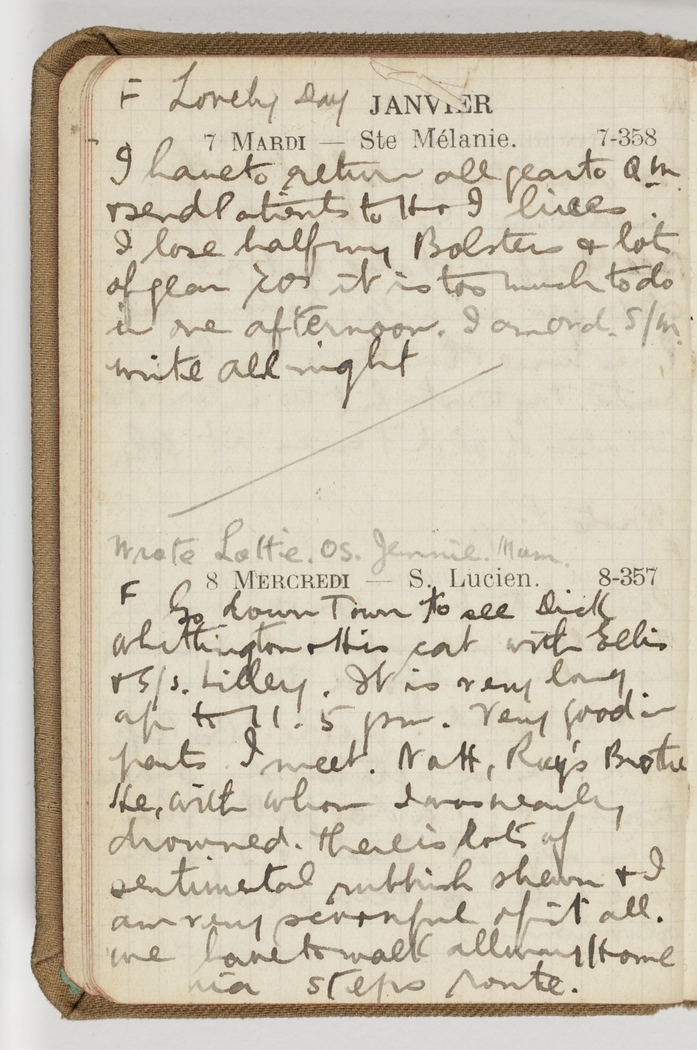Go down Town to see Dick Whittington & His Cat with Ellis & S/S Lilley. It is very long up to 11.15 pm. Very good in parts. I meet Natt, Roy's Brother. He, with whom I was nearly drowned. There is lots of sentimental rubbish shewn & I am very scornful of it all. We have to walk all way Home via steps route.