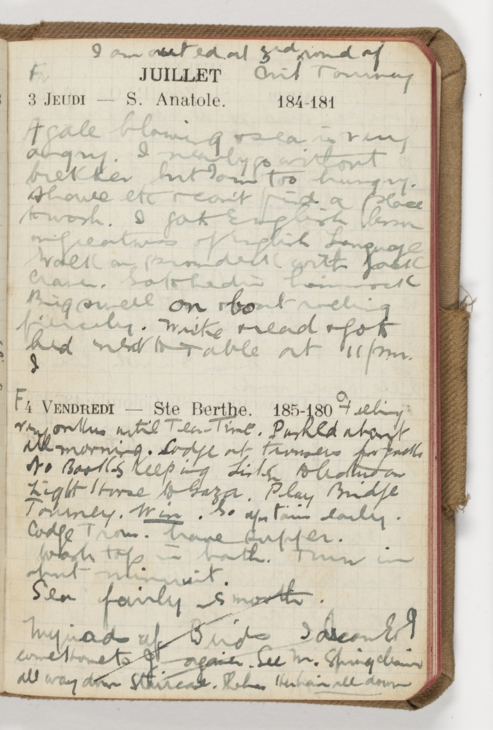 Feeling very onkers until Tea-time. Pushed about all morning. Cadge at trousers for packs. No Book-keeping. Listen to lecture on Light Horse to Gaza. Play Bridge Tourney. Win. Go up starirs early. Cadge Trous, have supper. Wash tops in bath. Turn in about minuint.