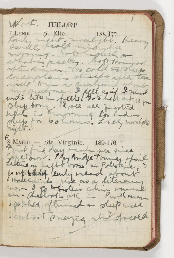 Lovely night – moonlight. Heavy swell, cold miserable morning. Go to English on What is Poetry. Go to hammock after dinner. Too cold to sleep come up stairs straight after tea, write to M in a quatrain about my pretty one. I feel as if I must write like it feels. Go to bed at 11 pm sleep bonz. I see all frosted lights in morning Els had no sleep for 60 hours. Lovely moonlight night.