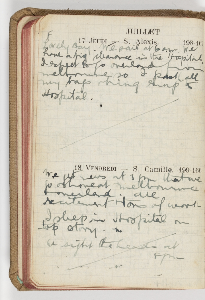 We get news at 3 pm that we go ashore at Melbourne & overland. All excited & tons of work. I sleep in Hospital on top story.