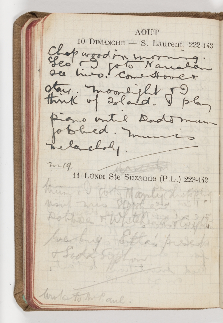 Chop wood in morning. Geo & I go to Narrabeen see Livo. Come Home & stay. Moonlight & I think of Island. I play piano until Dad & Mum go to bed. Mum is melancholy.