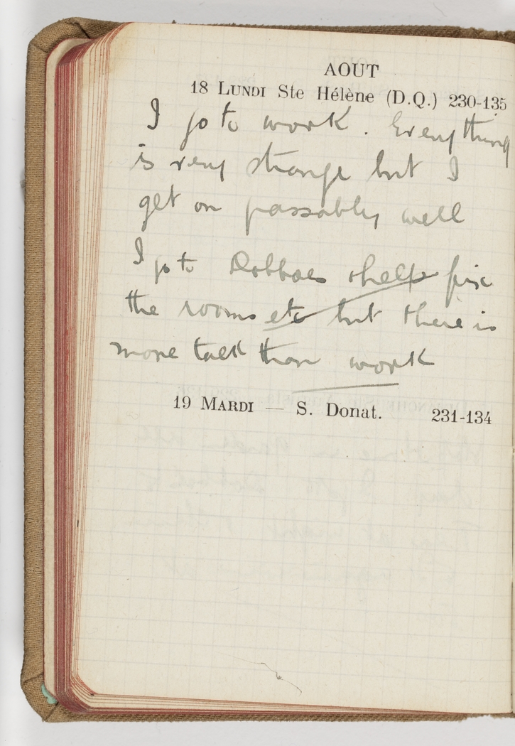 I go to work. Everything is very strange but I get on passably well. I go to Dobboes & help fix the rooms etc but there is more talk than work.