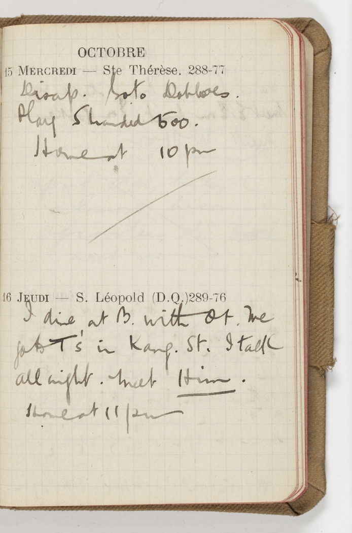 I dine at B with Ot. We go to T's in Kang St. I talk all night. Meet Him. Home at 11 pm.