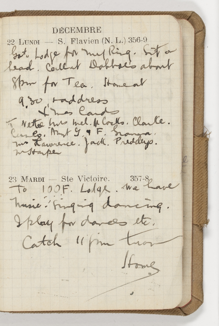 Go to Lodge for my Ring. Sit on beach. Call at Dobboe's about 8 pm for Tea. Home at 9.30 & address X'mas Cards to Nettie, Mrs Mel, M Cocks, Clarke, Cuneo, Aunt G, & F, Granma, Mrs Lawrence, Jack, Preddys, M Harper.