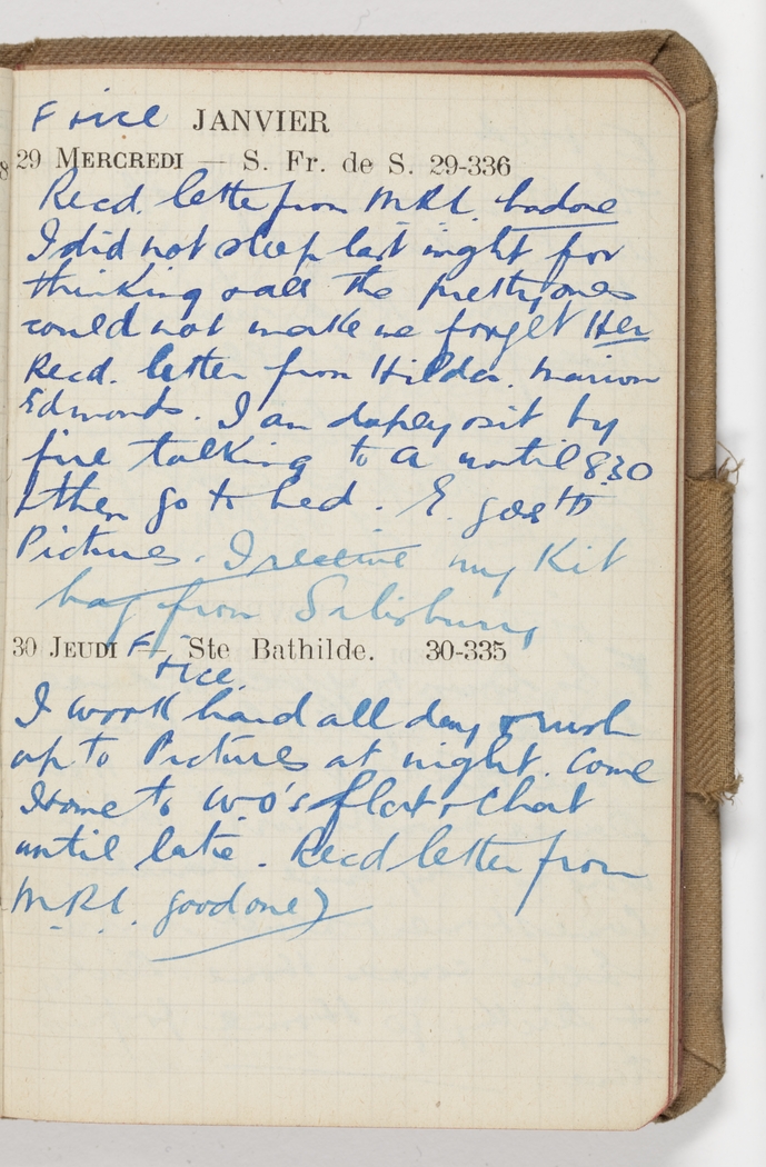 Recd letter from MRL bad one. I did not sleep last night for thinking & all the pretty ones could not make me forget Her. recd letter from Hilda, Marion Edwards. I am dopey & sit by fire talking to A until 8.30 & then go to bed. E goes to Pictures. I receive my kit bag from Salisbury.
