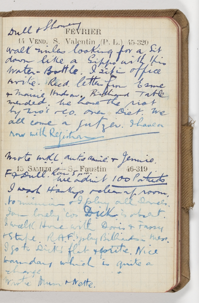 We admit 100 Patients. I wash Hankeys & clean up room. No musician & I play all Dances. I am lonely 'cos Dick is absent. I walk Home with Doris & Fassy & Stupe. R.A.F.'s play Billiards in Mess. I go to Dick's flat & write. Nice warm day which is quite a change.