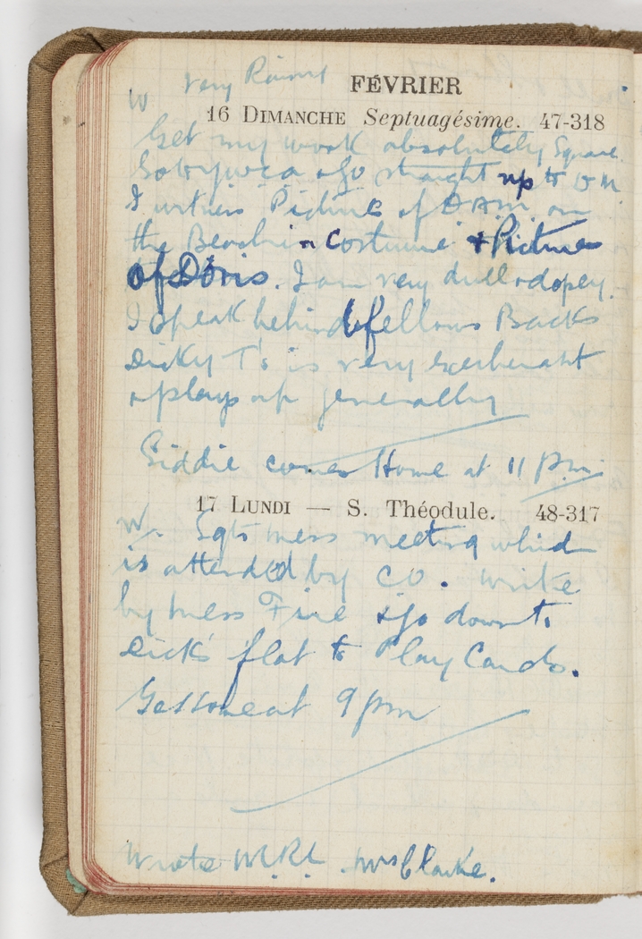 Get my work absolutely square. Go to Y.M.C.A. & go straight up to D.M. I witness Pictures of D.A.M. on the Beach in Costume & Pictures of Doris. I am very dull & dopey. I speak behind fellows Backs. Dicky T's is very exuberant & plays up generally.