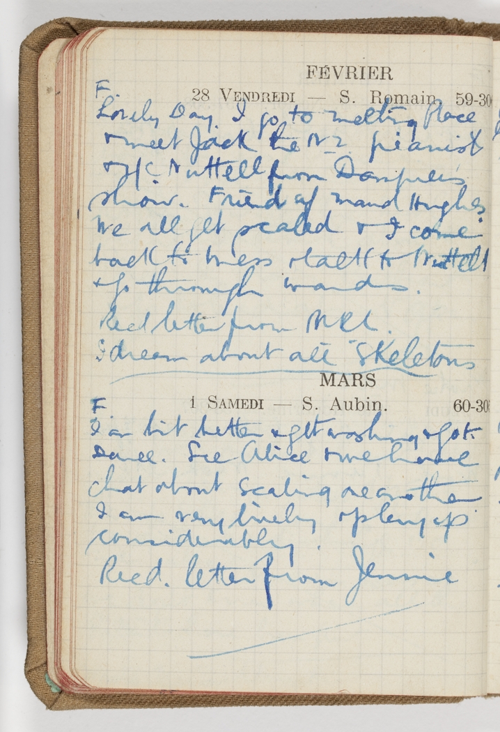 Lovely Day. I go to meeting Place & meet Jack the N.Z. pianist & L/C Nuttell from Dampreis show. Friend of Maud Hughes. We all get scaled & I come back to Mess & talk to Nuttell & go through wards.
