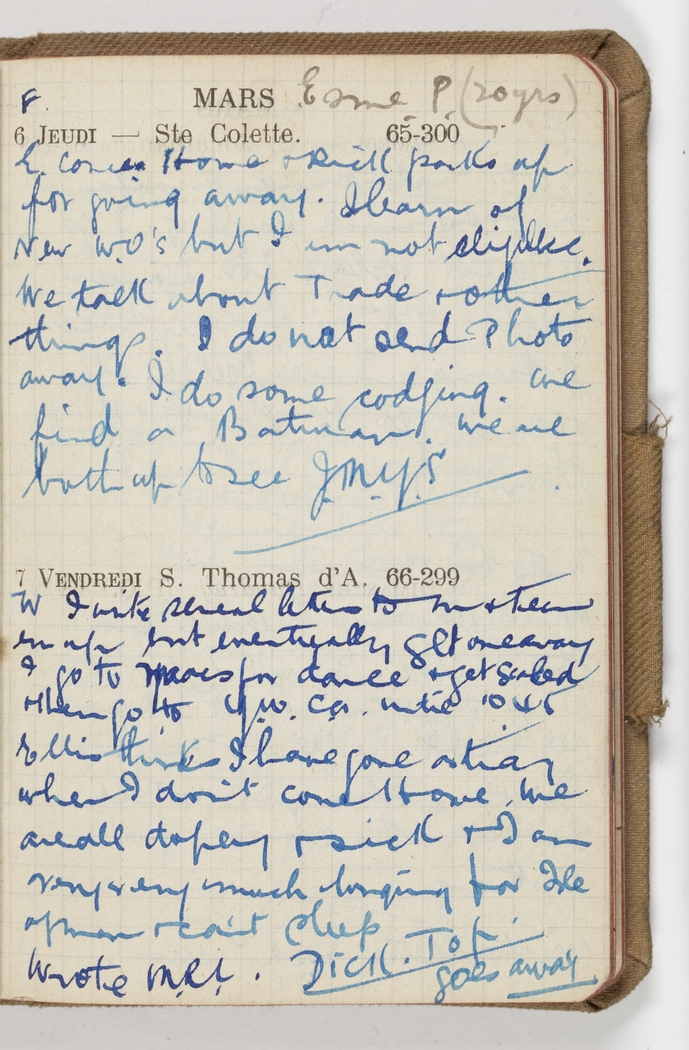 I write several letters to M & Tweam en[d] up eventually get one away & go to [indecipherable] for dance & get scaled them go to Y.W.C.A. until 10.45. Ellis thinks I have gone astray when I don't come home. We are all dopey & sick & I am very very much longing for Isle of Man & can't sleep.