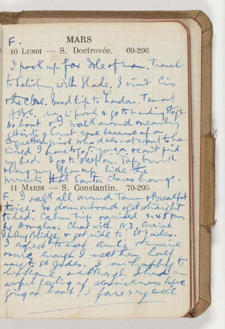 I pack up for Isle of Man. Travel to Salisbury with Slade. I visit Cis & the Close. Good trip to London. Tea at A.B.C. in L'pool & go to Landing Stage. No boat & I walk around nearly get into a Court case because of a coquettish Miss who does not want to be kissed. I have to go to Y.M.C.A. & can't find my bed. I go to sleep on Top bunk & hang my gear up like the presents that Santa Claus hangs.