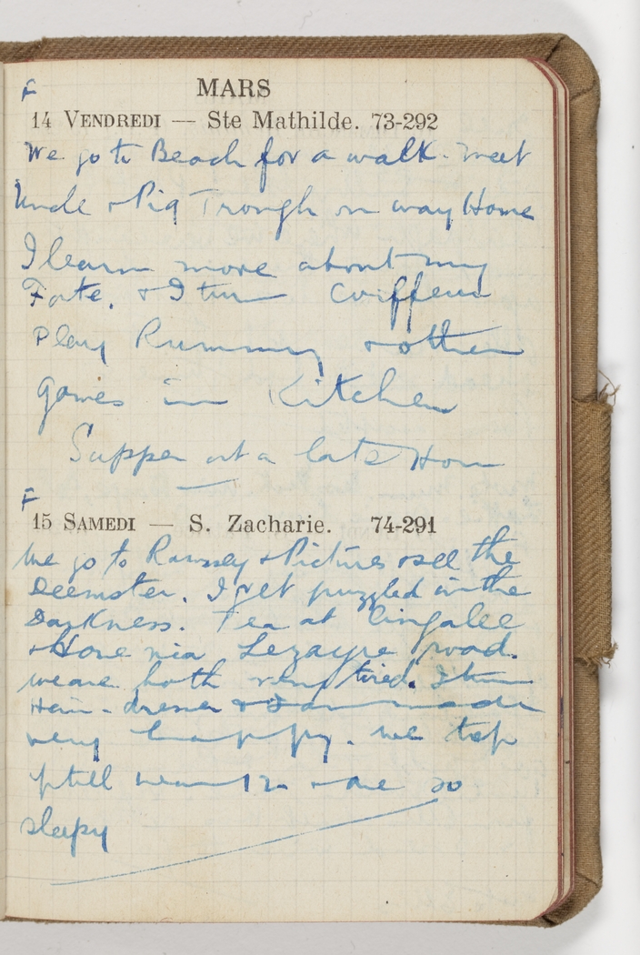 We go to Beach for a walk. Meet Uncle & Pig Trough on way home. I learn more about my Fate & I tin coiffeur. Play Rummy & other games in Kitchen. Supper at a late Home.