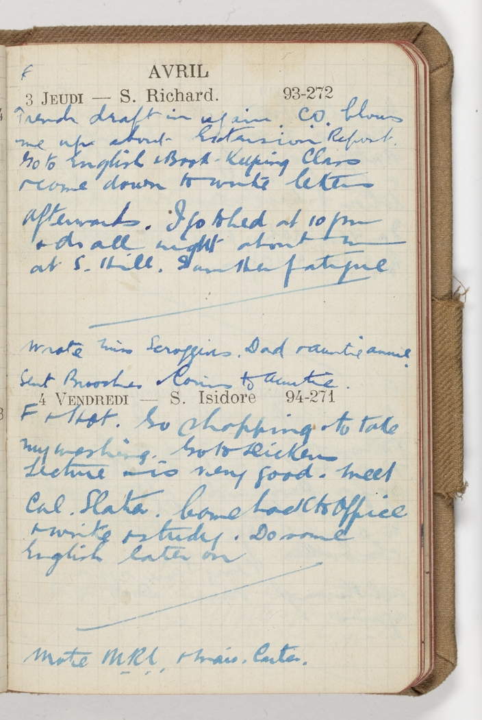 French draft in again. C.O. blows me up about Extension Report. Go to English & Book-Keeping Class & come down to write letters.