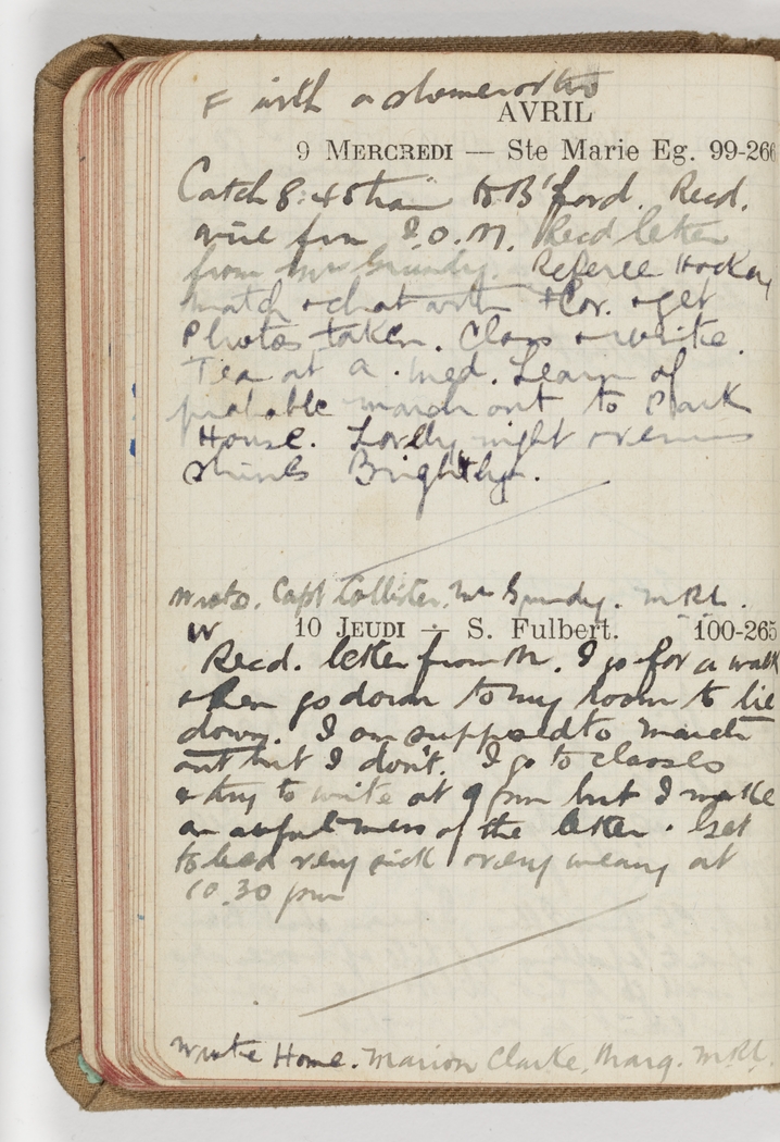Recd letter from M. I go for a walk & then go down to my room to lie down. I am supposed to march out but I don't. I go to classes & try to write at 9 pm but I make an awful mess of the letter. Get to bed very sick & very weary at 10.30 pm.