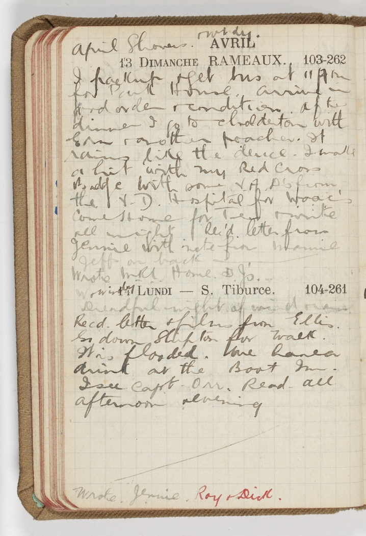 I pack up & get bus tat 11 am for Park House. Arrive on good order & condition. After dinner I go to Cholderton with Ern & another poacher. It rains like the deuce. I make a hit with my Red Cross Badge with some V.A.D.'s from the V.D. Hospital for W.A.A.C.'s. Come home for tea & write all night. Recd letter from Jennie with note from Mamie Jeffs on back.