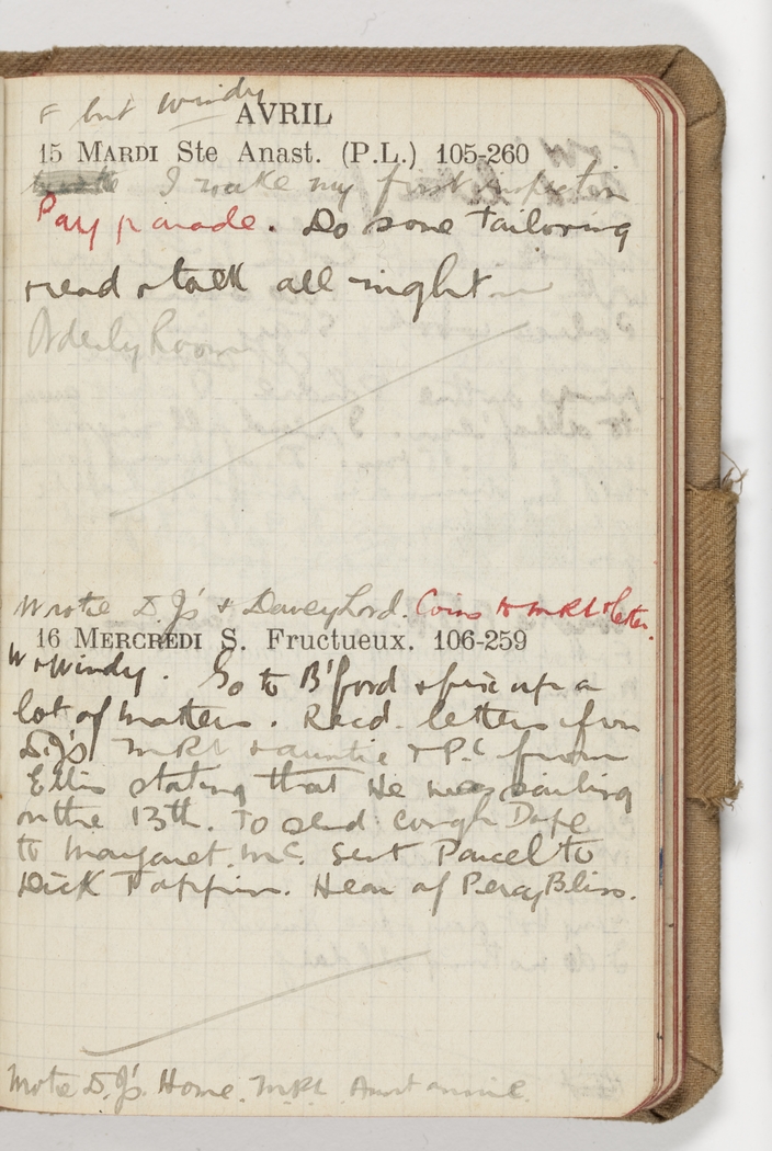 I make my first inspection. Pay Parade. Do some tailoring & read & talk all night in Orderly Room.