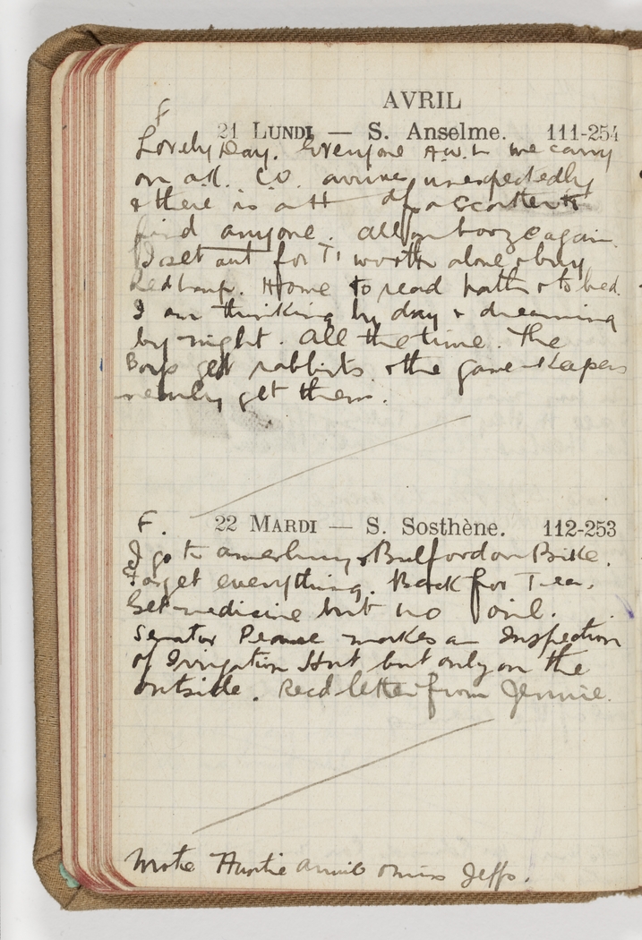 Everyone A.W.L. we carry on OK. C.O. arrives unexpectedly & there is a H--- of a scatter to find anyone. All on booze again. I set out for T'worth alone & buy Red Lamp. Home to read bath & to bed. I am thinking by day & dreaming by night. All the time. The boys get rabbits & the game keepers nearly get them.