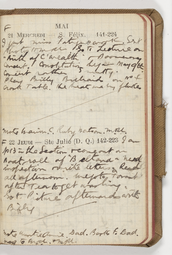 I just miss fatigue work. Sent photos to MRL. So to Lecture on "Birth of C'wealth" & Boomerang Concert. Constituting began May 9th. Concert rather smutty. Play Billy Billiards on No 4 Crook Table. He beats me by flukes.