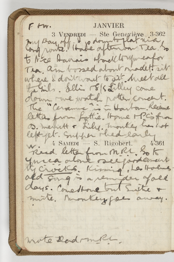 My day off. I go down to flat via long route. Have afternoon tea. Go to Nice Harrais & back to YMCA for Tea. Am bossed about & made to sit where I don't want to sit. Meet all the Girls. Ellis & S/S Lilley come down & we watch rotten concert.