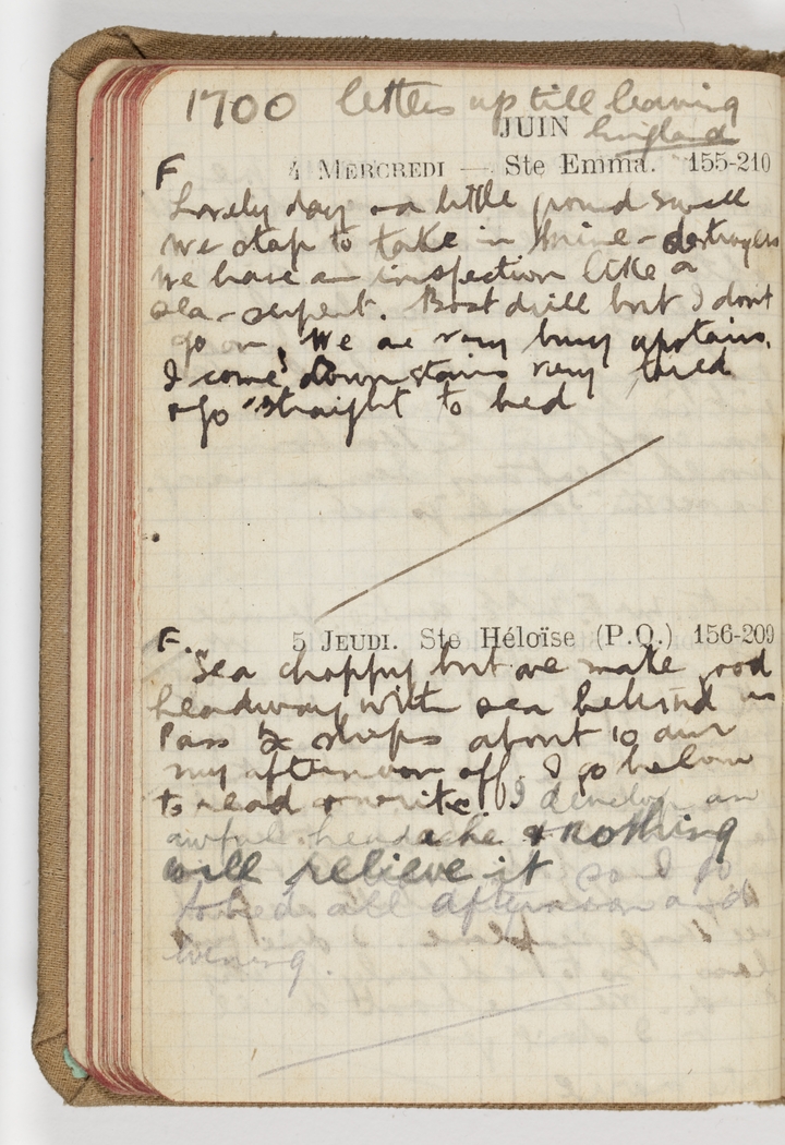 Lovely day & a little ground swell. We stop to take in Mine-destoyers. We have an inspection like a sea-serpent. Boat drill but I don't go on. We are very busy upstairs. I come downstairs very tired & go straight to bed.