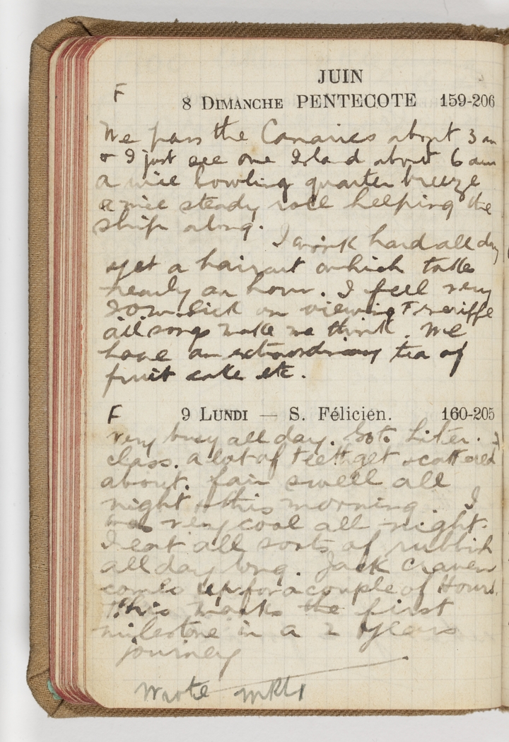 Very busy all day. Go to hi tea 2 class. A lot of teeth get scattered about. Fair swell all night & this morning. I was very cool all night. I eat all sorts of rubbish all day long. Jack Craven comes up for a couple of hours. This marks the first milestone in a 2 year journey.
