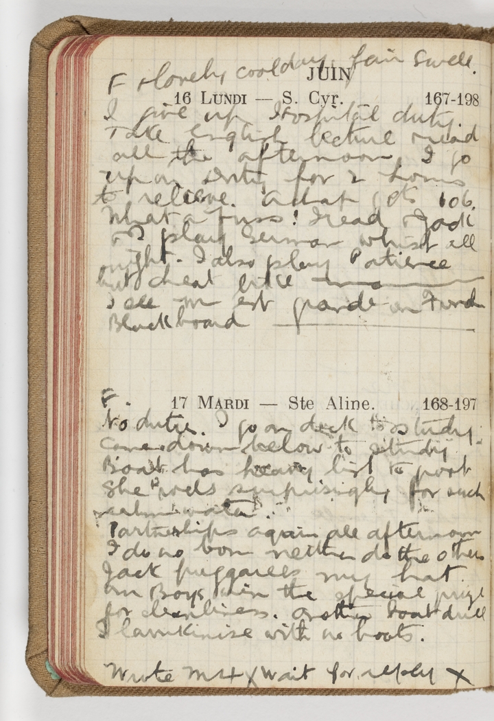 I give up Hospital duty. Take English lecture & read all afternoon. I go up on Duty for 2 hours to lelieve. A chap gets 106. What a fuss! I read & Jack & I play German whist all night. I also play Patience but cheat like m--------. I see M est grande on French Blackboard.