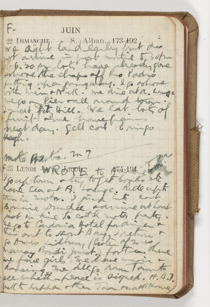 I go up town & try to get Books etc, have tea at A Lounge. Ride up to town in motor. I jump into cab Bonnie Dundee & arrive at boat just in time to catch motor party. We go to Cardonia Hotel for dinner & then out to Hout Bay. I return & go to Mrs Lidbury (Sister of Mrs Murray, Bondi Junct.) for Tea. There are five girls. We have music & dancing. We all go down Town to see whether a peace is signed. H.A.D. back to supper other Town & walk Home.
