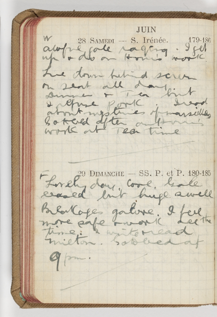 Awful gale raging. I get up & do an hour's work. Lie down behind screen on seat all day. Dinner & tea but I refuse pork. I read about mysteries of Marseilles. Go to bed after an hour's work at Tea time.
