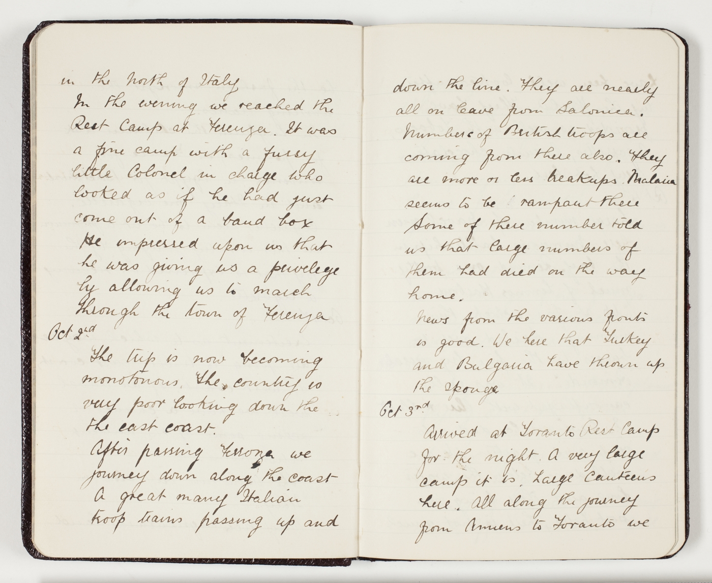 Arrived at Toranto [possibly Taranto] Rest Camp for the night. A very large camp it is. Large Canteens here. All along the journey from Amiens to Toranto we