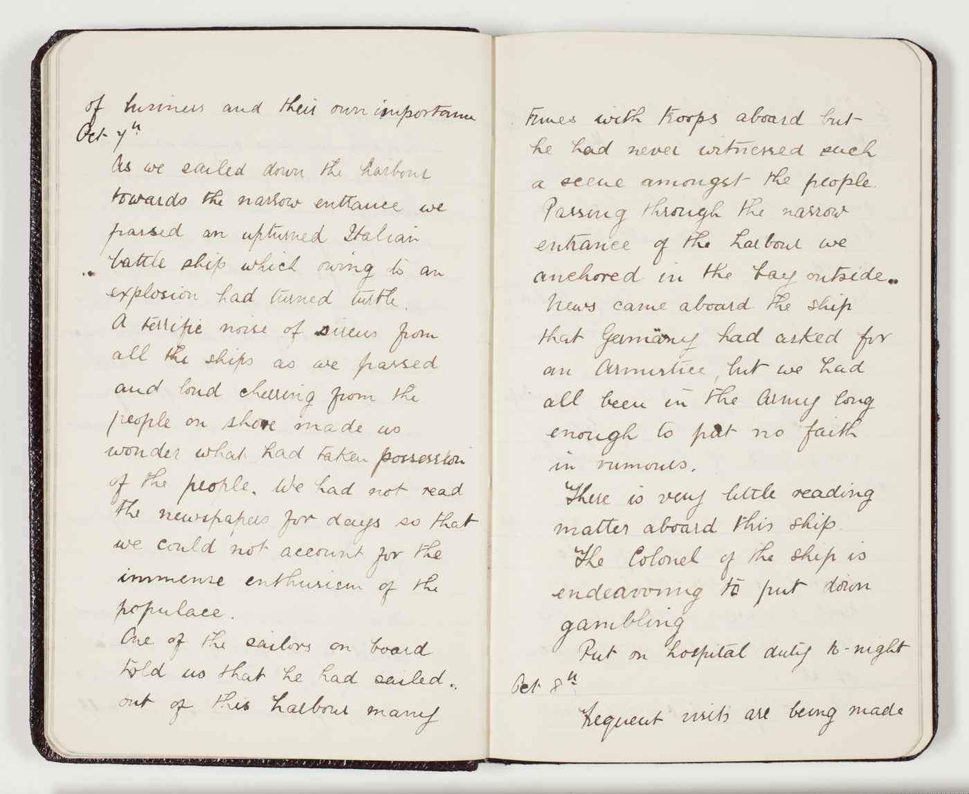 As we sailed down the harbour towards the narrow entrance we passed an upturned Italian battle ship which owing to an explosion had turned turtle. A terrific noise of sirens from all the ships as we passed and loud cheering from the people on shore made us wonder what had taken possession of the people. We had not read the newspapers for days so that we could not account for the immense enthusism of the populace.