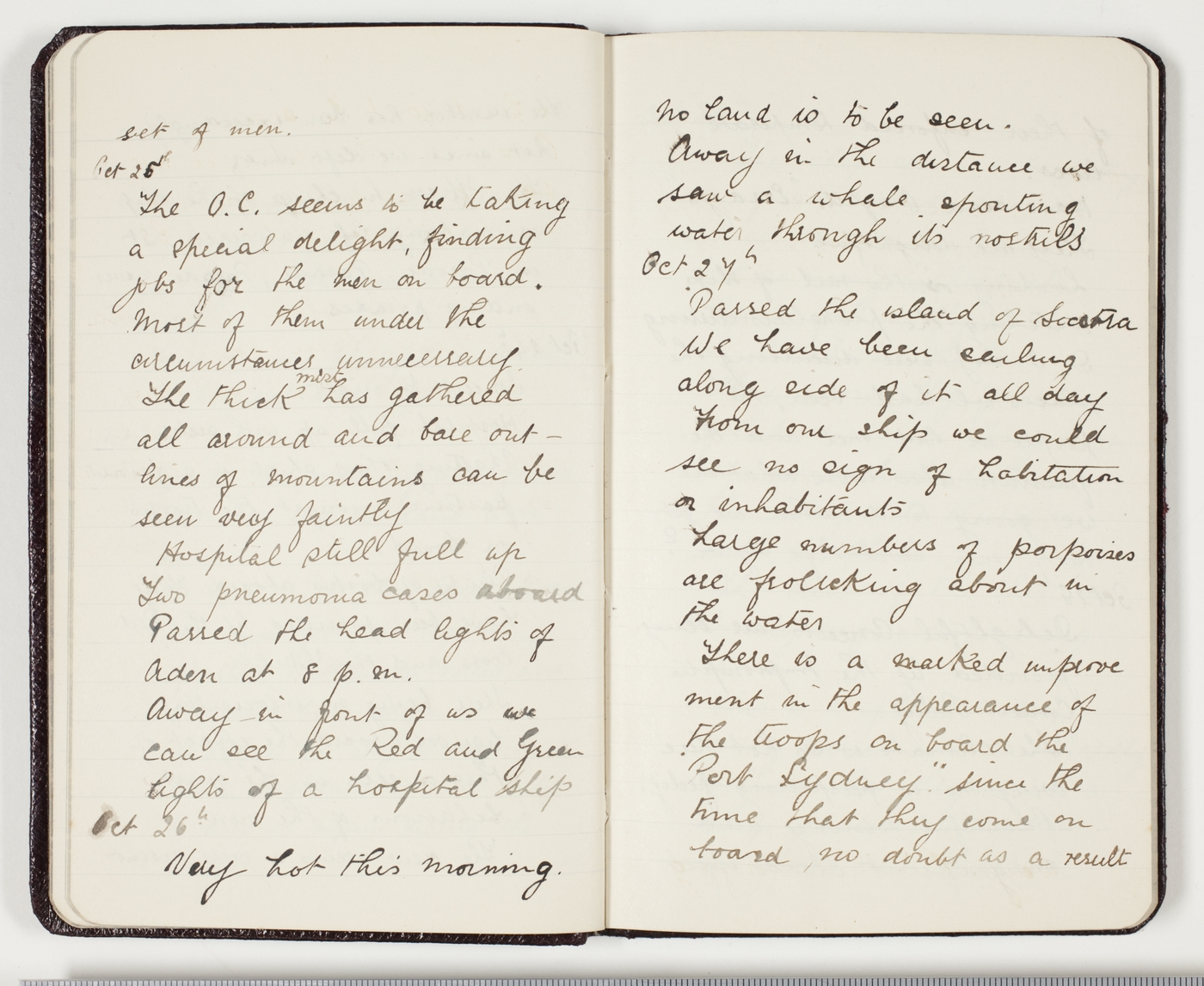 Hospital still full up. Two pneumonia cases aboard. Passed the head lights of Aden at 8 p.m.