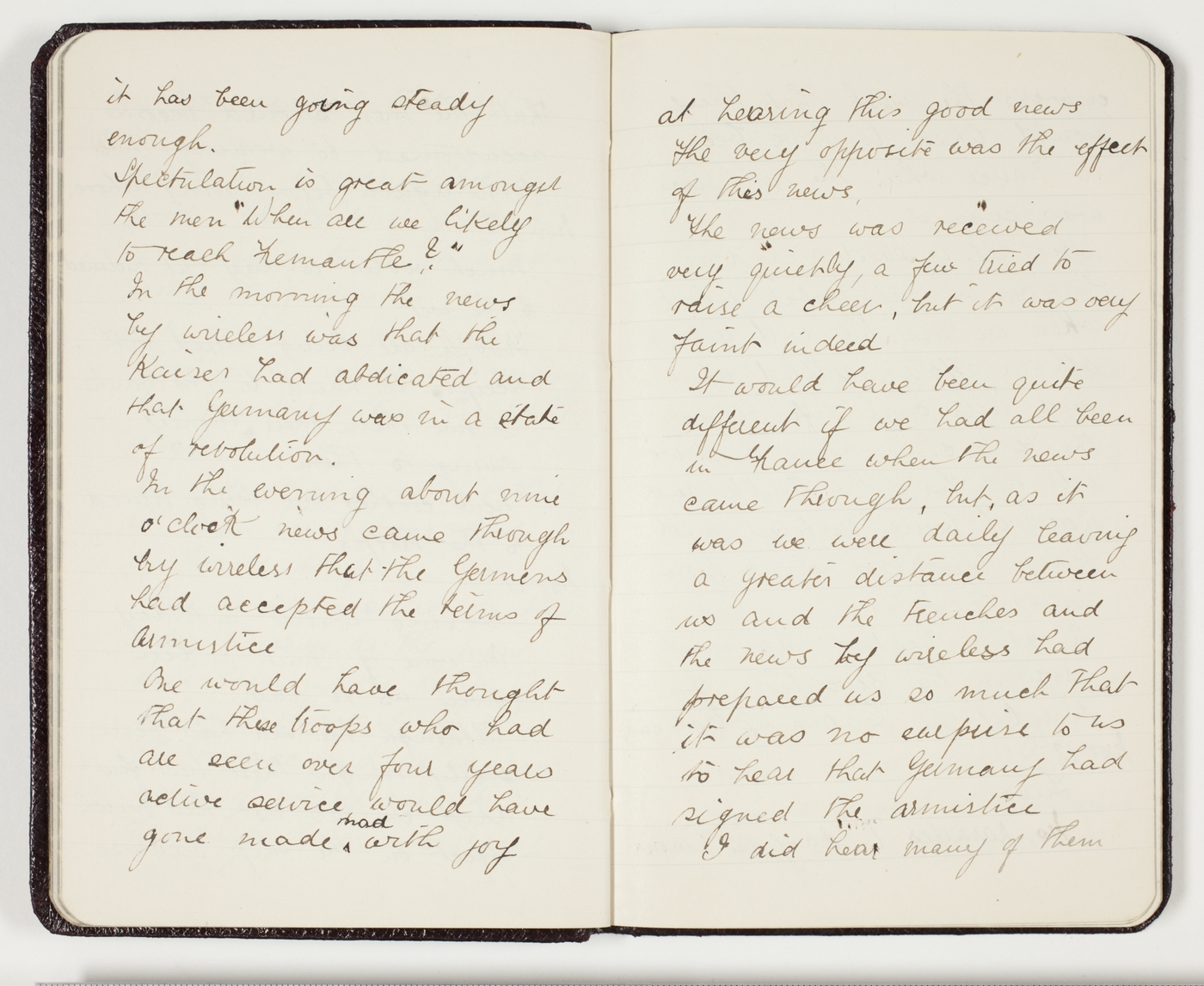 In the morning the news by wireless was that the Kaiser had abdicated and that Germany was in a state of revolution.