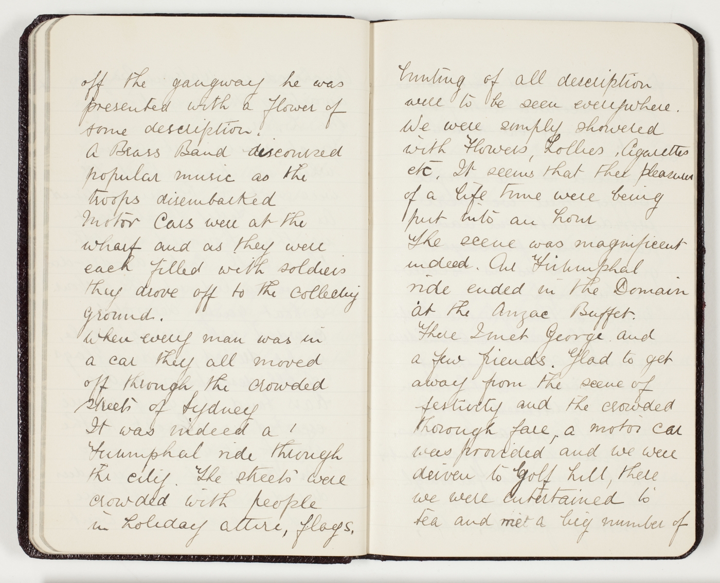 It was indeed a Triumphal ride through the city. The streets were crowded with people in holiday attire, flags, bunting of all description were to be seen everywhere. We were simply showered with Flowers, Lollies, Cigarettes etc. It seems that the pleasures of a life time were being put into an hour. The scene was magnificent indeed. Our Triumphal ride ended in the Domain at the Anzac Buffet. There I met George and a few friends. Glad to get away from the scene of festivity and the crowded thorough fare, a motor car was provided and we were driven to Golf hill, there we were entertained to tea and met a big number of