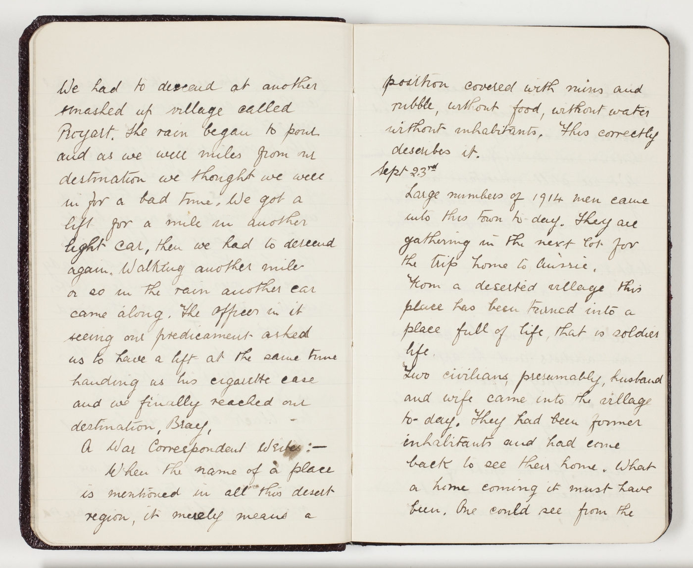 We had to descend at another smashed up village called Proyart. The rain began to pour and as we were miles from our destination we thought we were in for a bad time. We got a lift for a mile in another light car, then we had to descend again. Walking another mile or so in the rain another car came along. The Officer in it seeing our predicament asked us to have a lift at the same time handing us his cigarette case and we finally reached our destination, Bray.