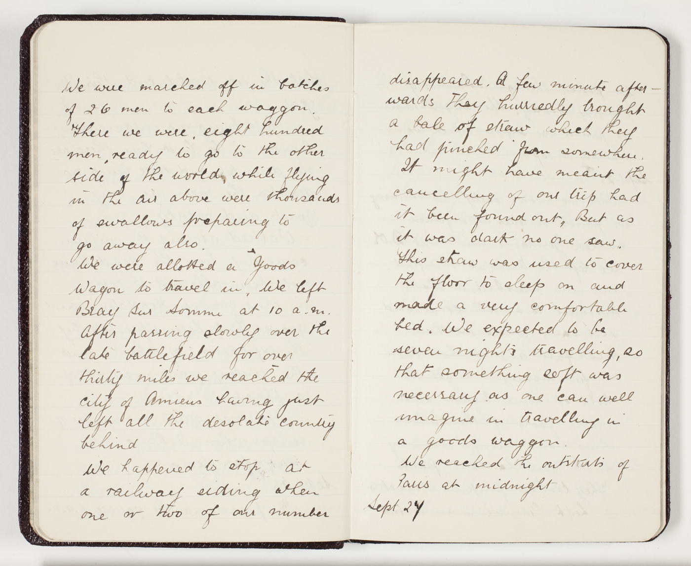 We were allotted a Goods Wagon to travel in. We left Bray sur Somme at 10 a.m. After passing slowly over the late battlefield for over thirty miles we reached the city of Amiens having just left all the desolate country behind.